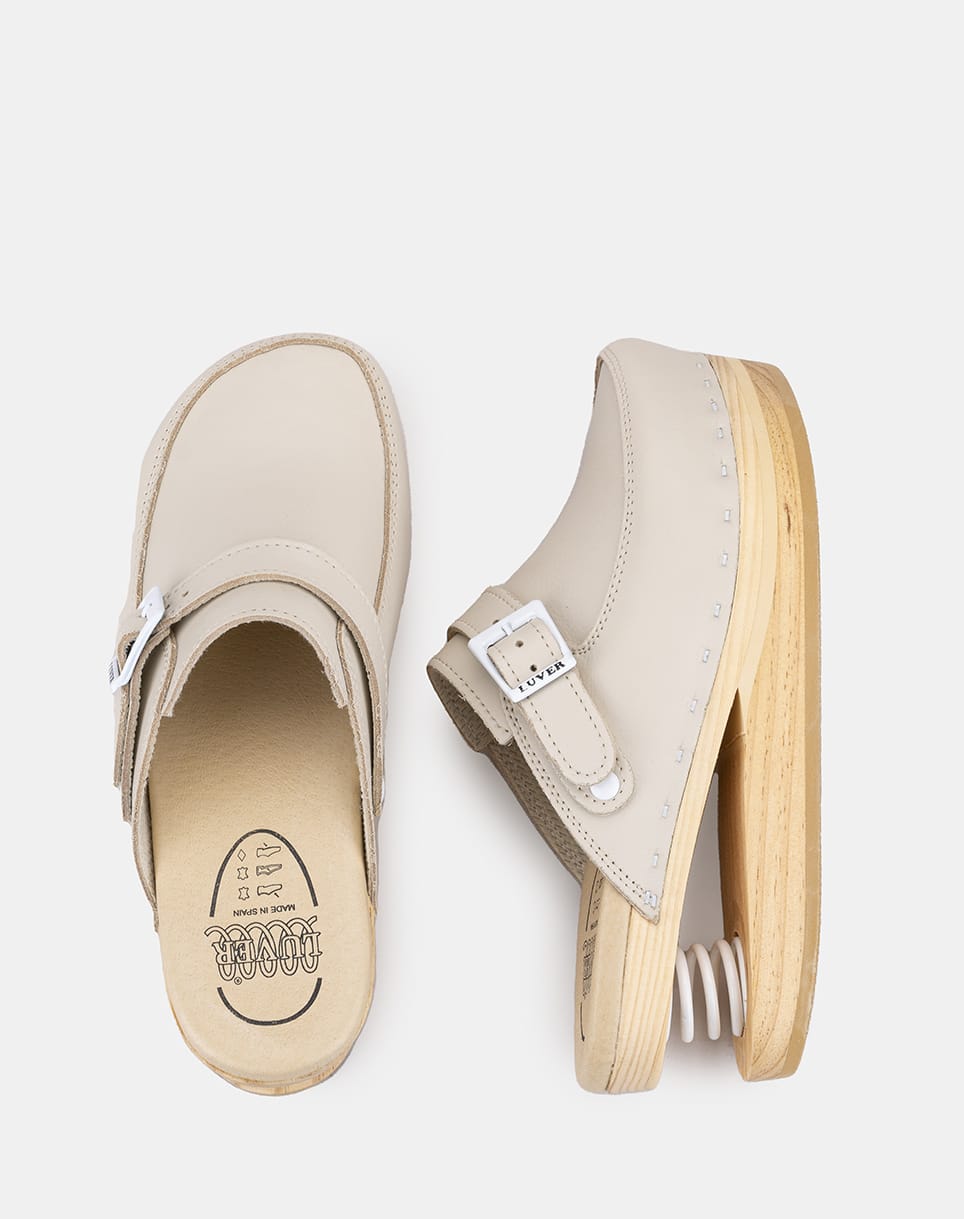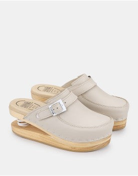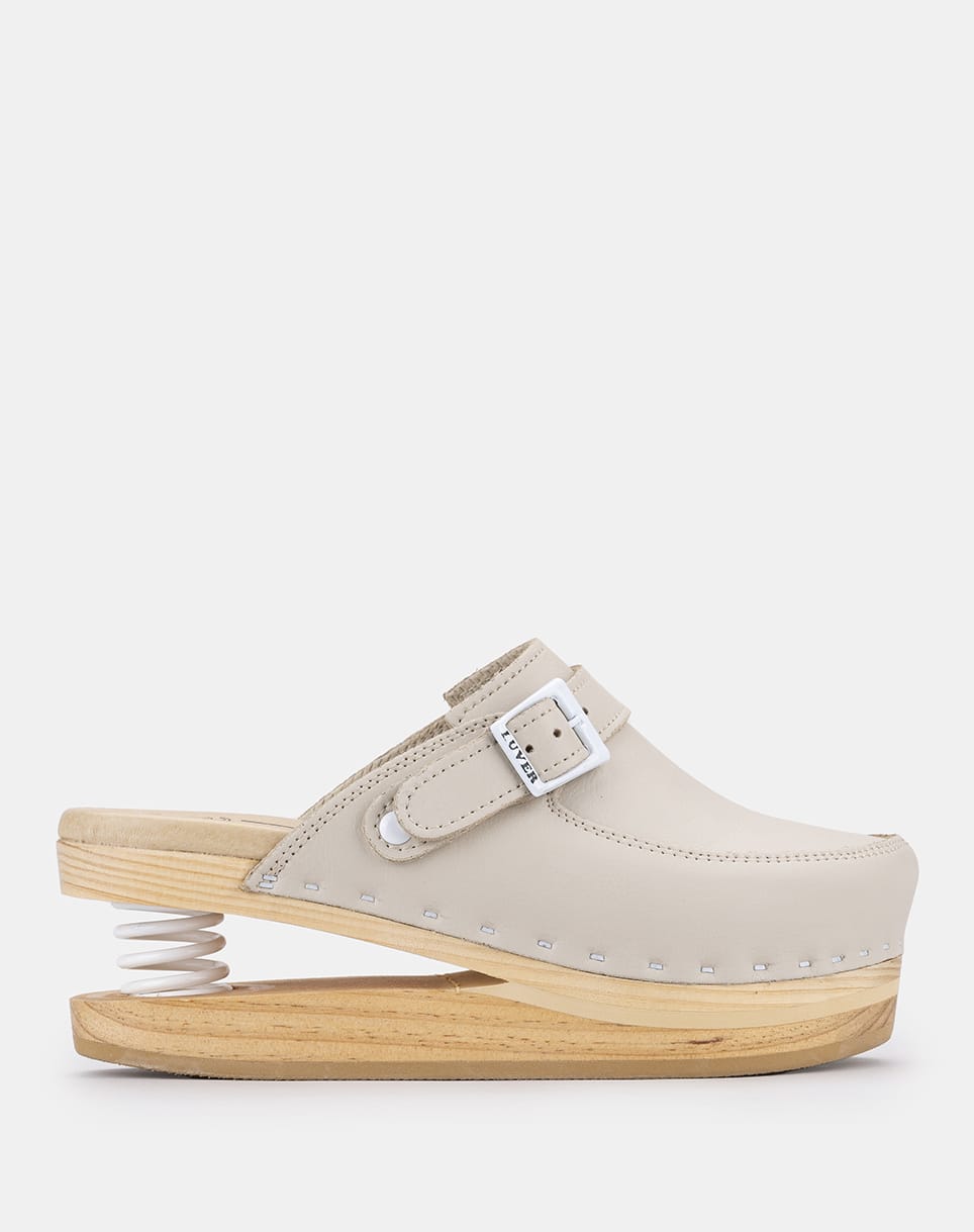Zueco cerrado liso con muelle con correa ajustable para la sujeción del talón, puntera reforzada y planta anatómica en piel. La incorporación del muelle entre dos suelas amortigua el impacto de cada uno de nuestros pasos, estimulando la circulación sanguínea y las articulaciones, reduce el cansancio, trauma y contusiones y alivia la zona cervical