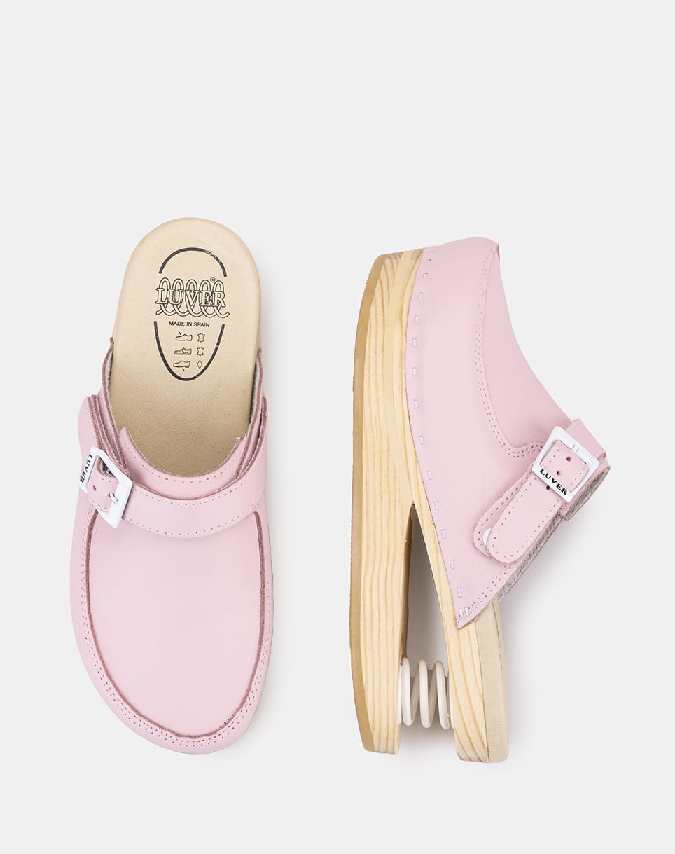 Zueco cerrado liso con muelle con correa ajustable para la sujeción del talón, puntera reforzada y planta anatómica en piel. La incorporación del muelle entre dos suelas amortigua el impacto de cada uno de nuestros pasos, estimulando la circulación sanguínea y las articulaciones, reduce el cansancio, trauma y contusiones y alivia la zona cervical.
